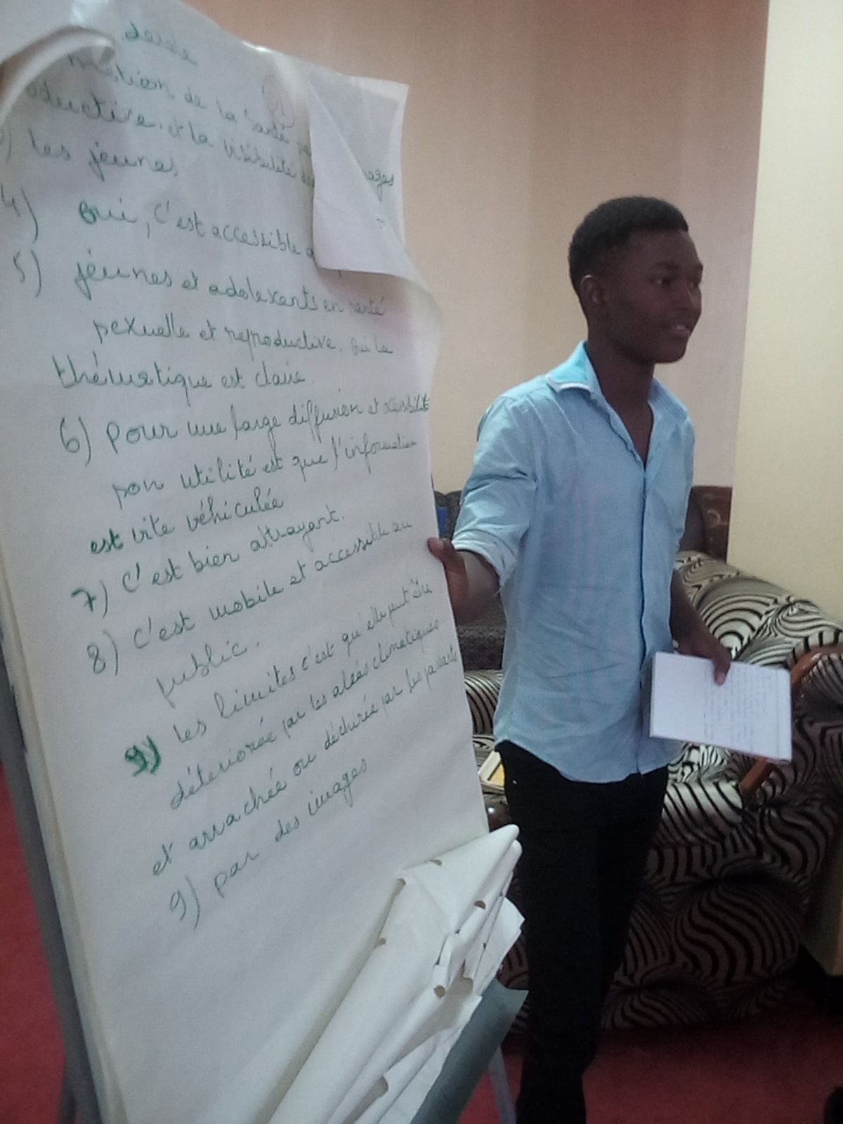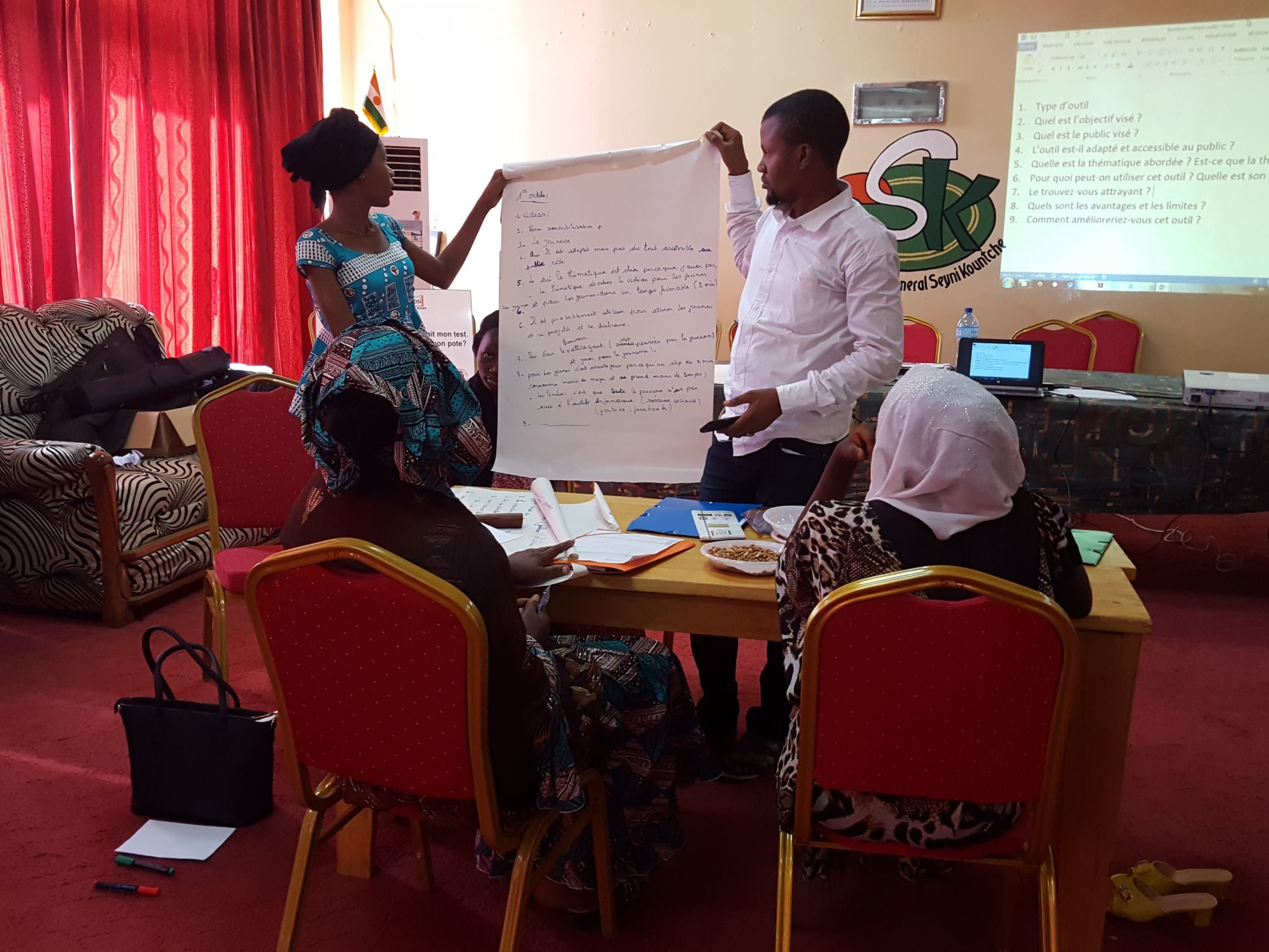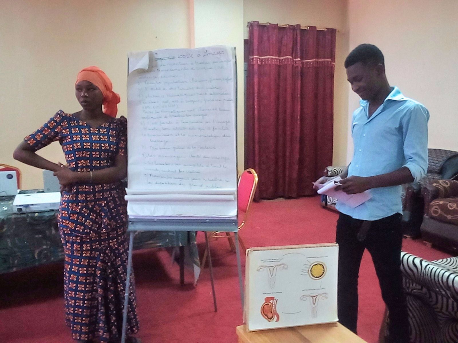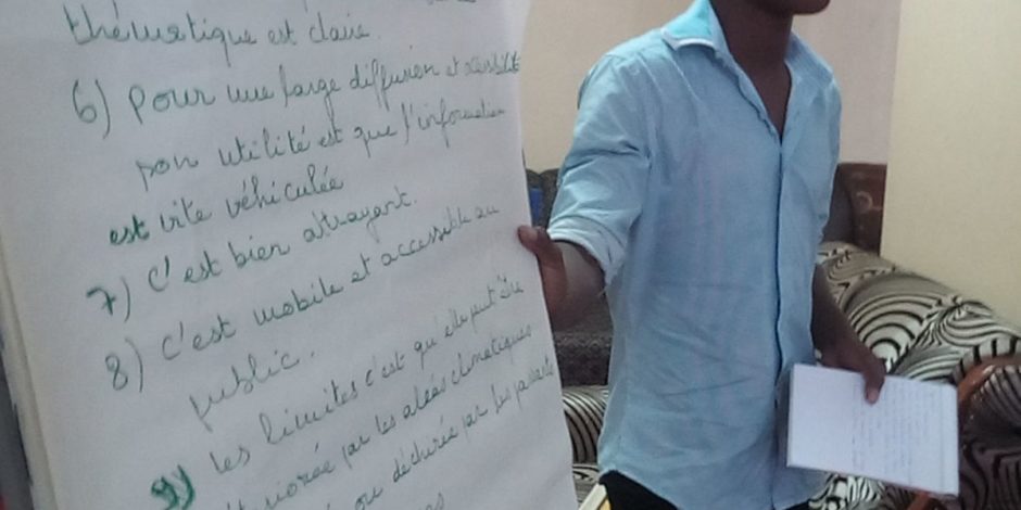 Une partie de l'atelier a consisté à passer en revue et faire une critique guidée et constructive des différents supports (dépliants, banderoles etc.) existants ainsi que des différents outils d'intervention (boites à images, pénis en bois etc.) déjà utilisés par les multiples partenaires œuvrant dans le champ des DSSR.